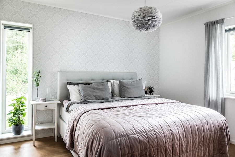 Vita väggar med fondtapet, svagt gråmönstrad