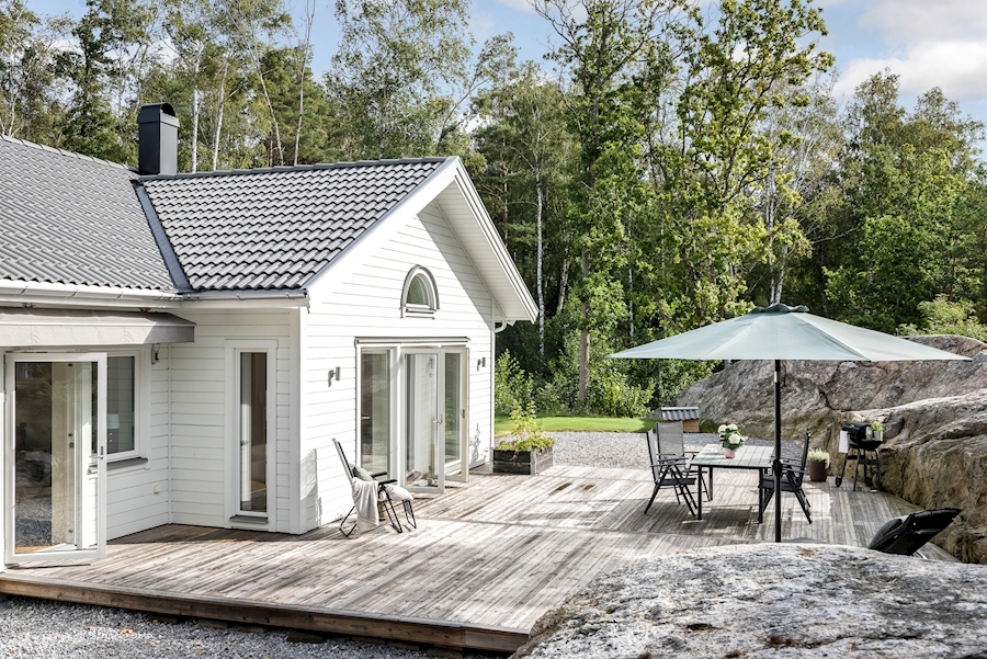 Utgång till altan och härlig plats i husets vinkel, markis