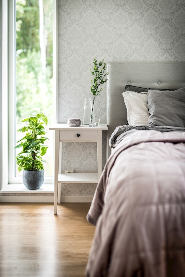 Diskret tapetserat i grått/vitt