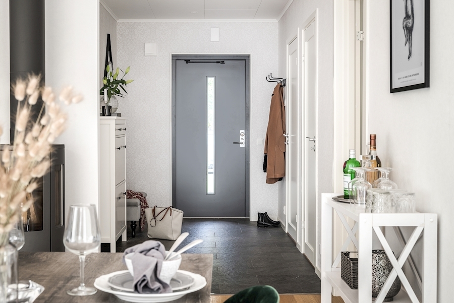 Grå klinker i hall, genomgående golvvärme i hela huset