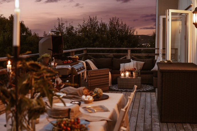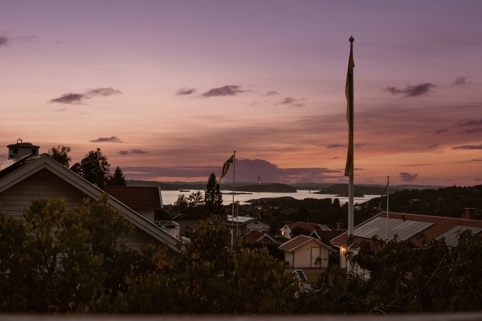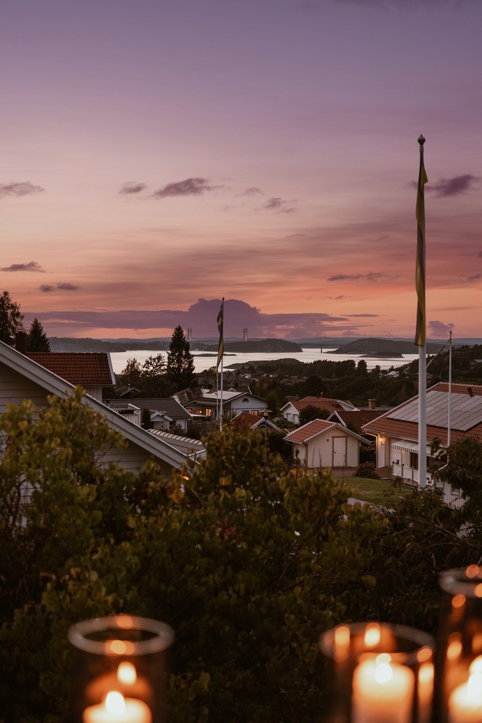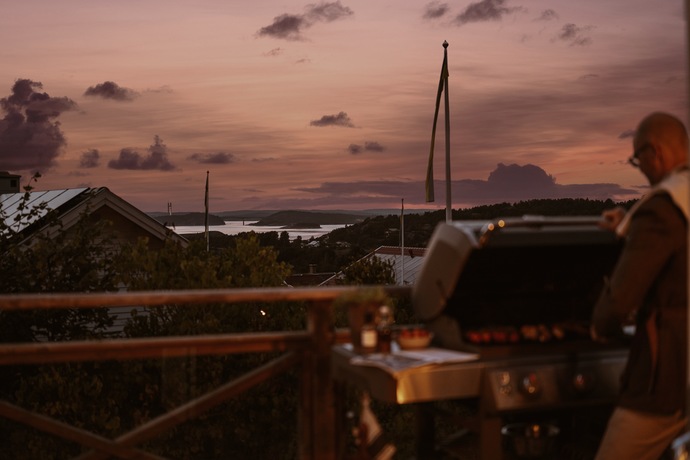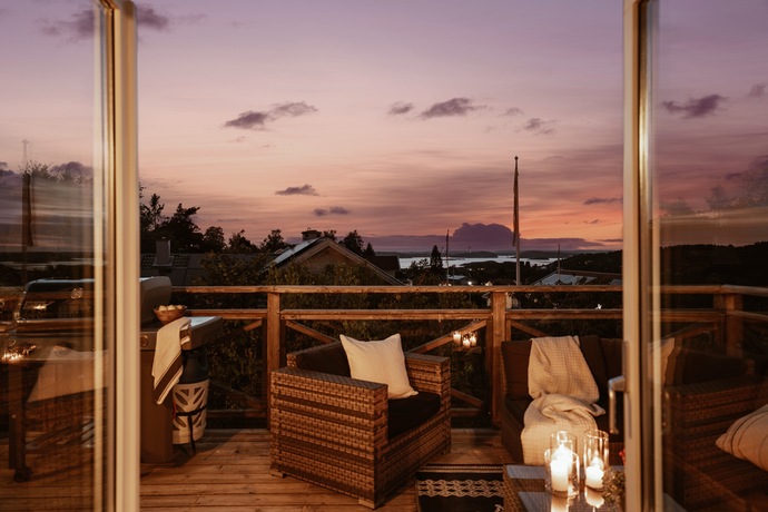 På övre plan öppnar sig en stor terrass med plats för hela familjen och lite till. Här njuter du av de vidsträckta vyerna över Hakefjorden och Tjörnbron, en utsikt som aldrig slutar imponera. Här utlovas fantastiska solnedgångar kan vi lova!
